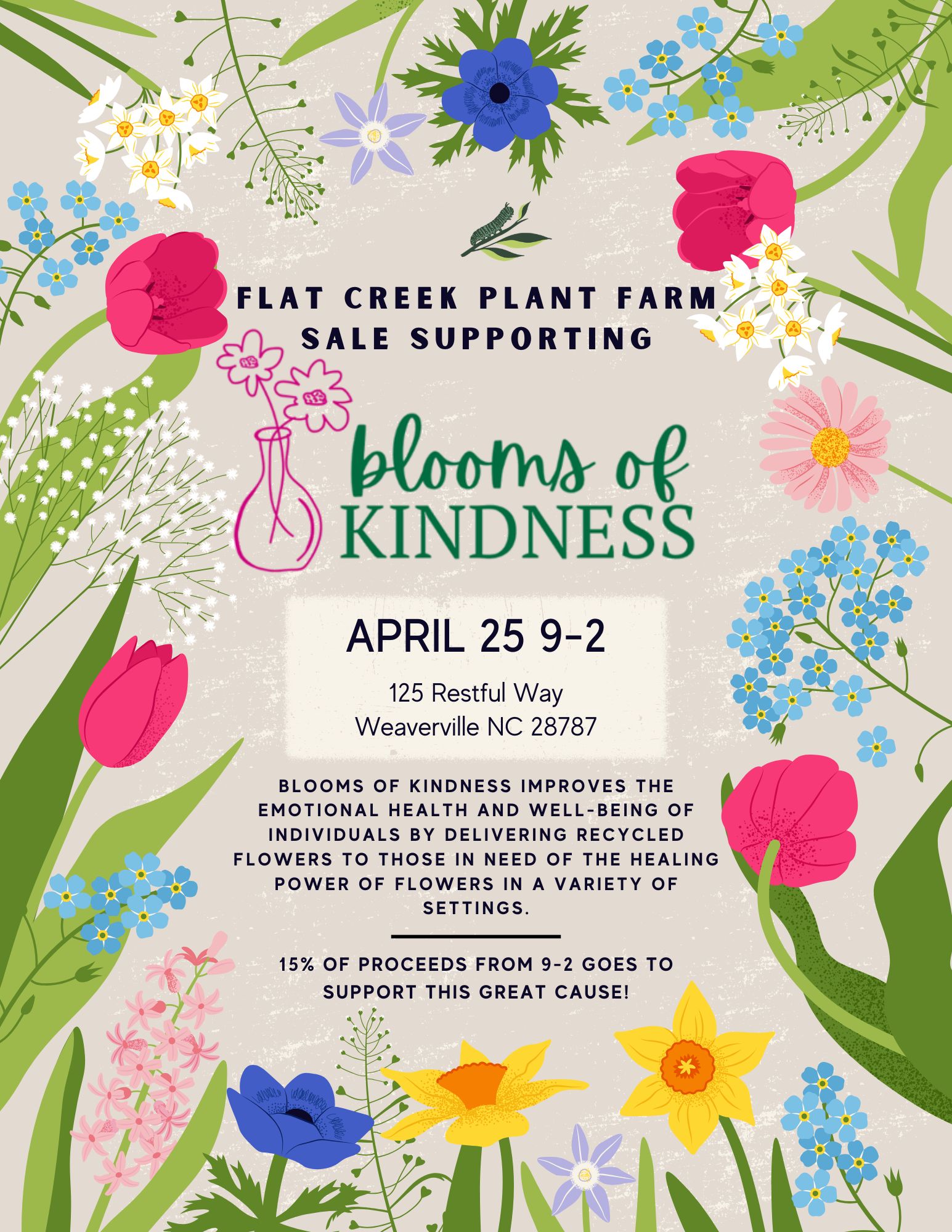 The wonderful Flat Creek Plant Farm is holding another plant sale this year benefitting our Blooms of Kindness organization.